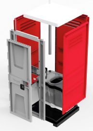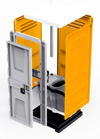 Стандартная комплектация: накопительный бак, сиденье с крышкой, пластиковый поддон, запирающее устройство с индикацией "Свободно-Занято", антивандальное крепление двери, вентиляционная труба, универсальные ушки для навесного замка, держатель для туалетной бумаги, крючок для одежды.