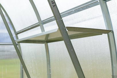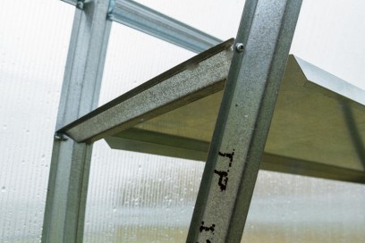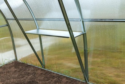 Удобная и прочная полочка из оцинкованного металла очень легко устанавливается на детали каркаса теплицы «ДАЧНАЯ–ТРЁШКА».